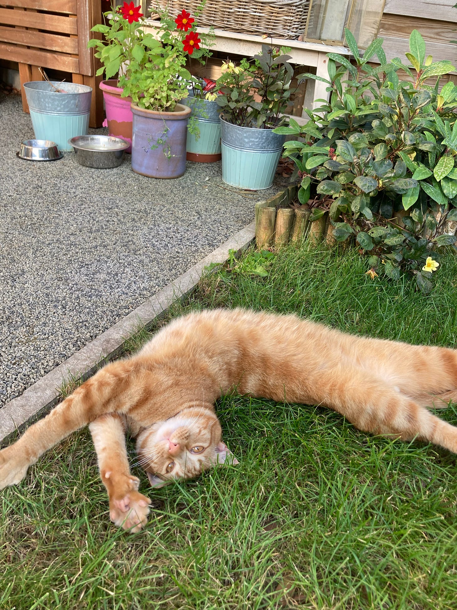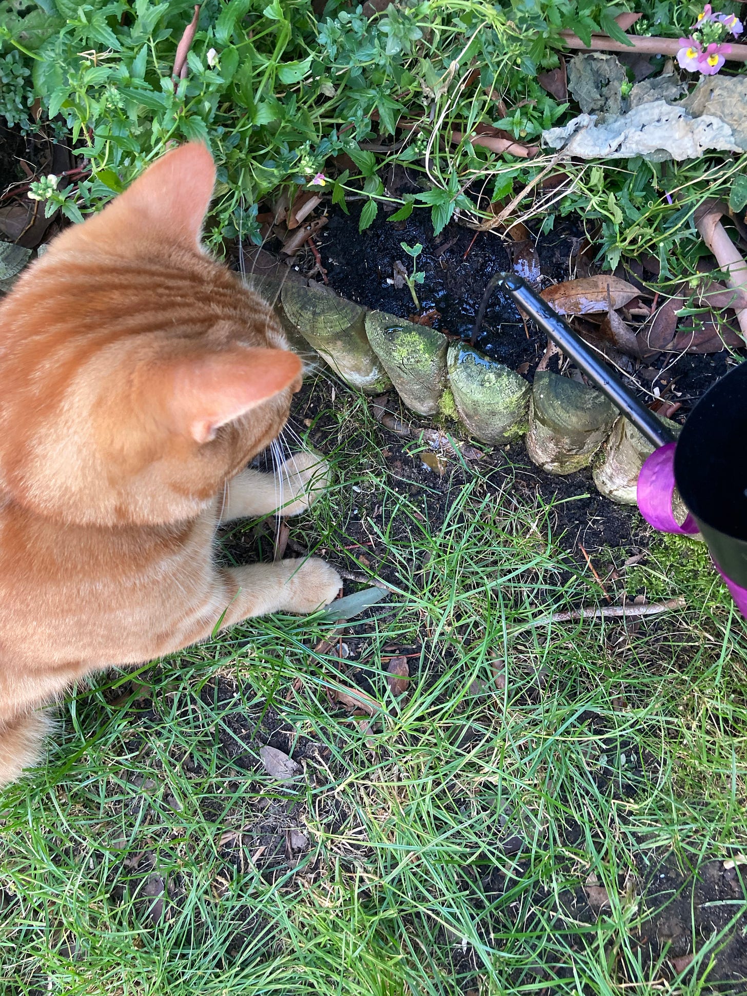 Noticing small treasures is the absolute spice of life for me, so you can imagine my delight when I saw a few nasturtium seedlings come up in the lawn of my cat sit. I dug them out and planted them in the garden (with permission, relax) and as you’ll see in the photos, my feline companion Oscar provided his careful oversight. He’s also obsessed with the trail the water makes when it comes out of the watering can spout so we’ve turned that info a fun game (laser pointer/string hybrid but with water trail). These kinds of discoveries (the weird things that pets are entranced by) are fascinating to me.